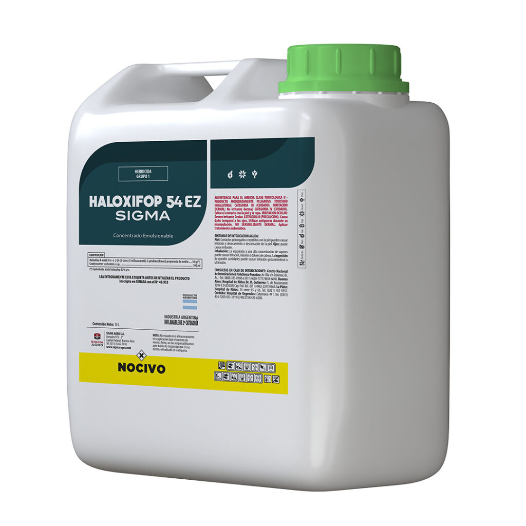 HALOXIFOP 54 EZ SIGMA ES UN HERBICIDA POSTEMERGENTE DE ACCIΓN SISTΓMICA SELECTIVO PARA CULTIVOS DE SOJA, GIRASOL, MANΓ, POROTO Y ALGODΓN. CONTROLA MALEZAS GRAMΓNEAS PERENNES Y ANUALES. LAS MALEZAS DETIENEN SU CRECIMIENTO Y LAS HOJAS MUESTRAN A LOS POCOS DΓAS DE LA APLICACIΓN TONALIDADES VIOLΓCEAS, AMARILLAS Y FINALMENTE MARRONES. EN LOS RIZOMAS, DESTRUYE INICIALMENTE LAS YEMAS Y LUEGO EL TEJIDO SE NECROSA.