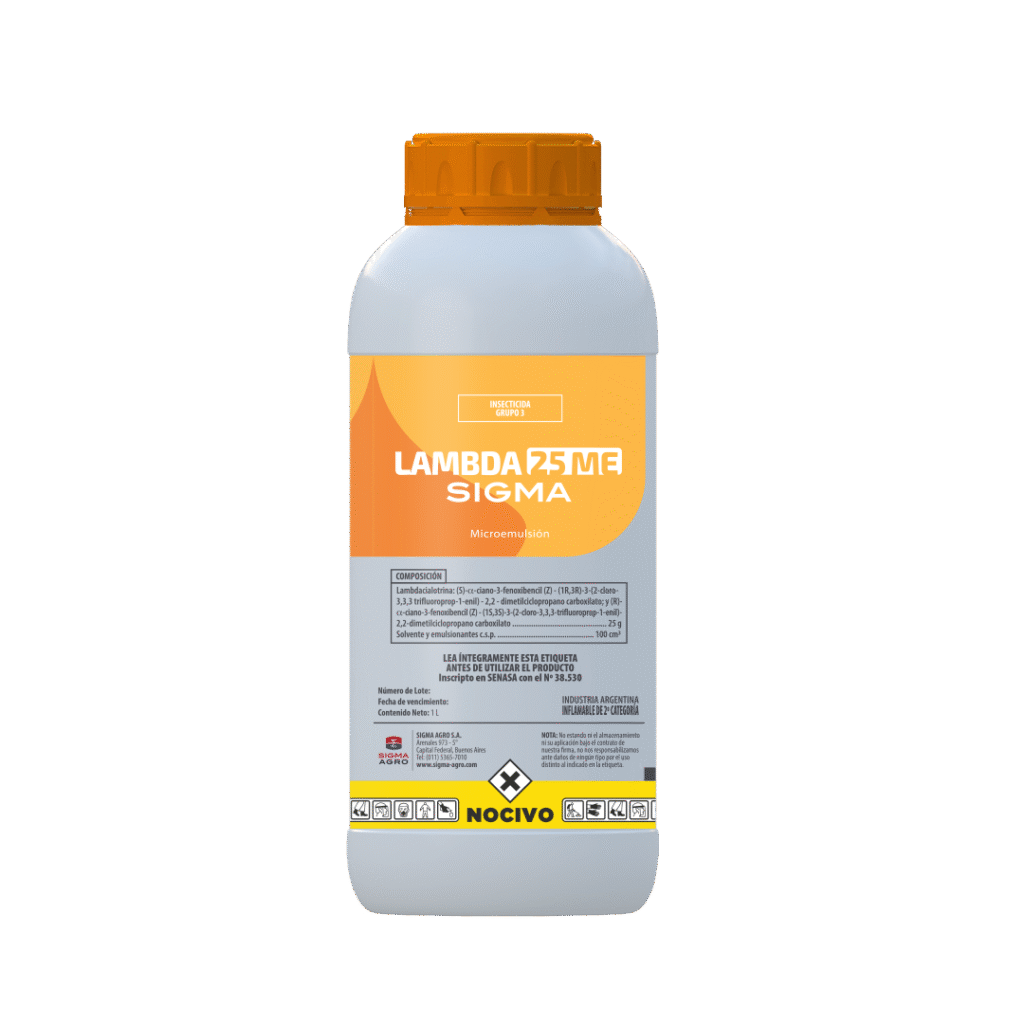 Lambda 25 me sigma es un insecticida piretroide que actua por contacto, ingestiΓ³n y repelencia para el control de larvas y adultos de insectos masticadores, picadores y chupadores, afectando ademΓ‘s la oviposiciΓ³n de ellos. Despues de la aplicaciΓ³n los insectos se alejan del sector y dejan de alimentarse.