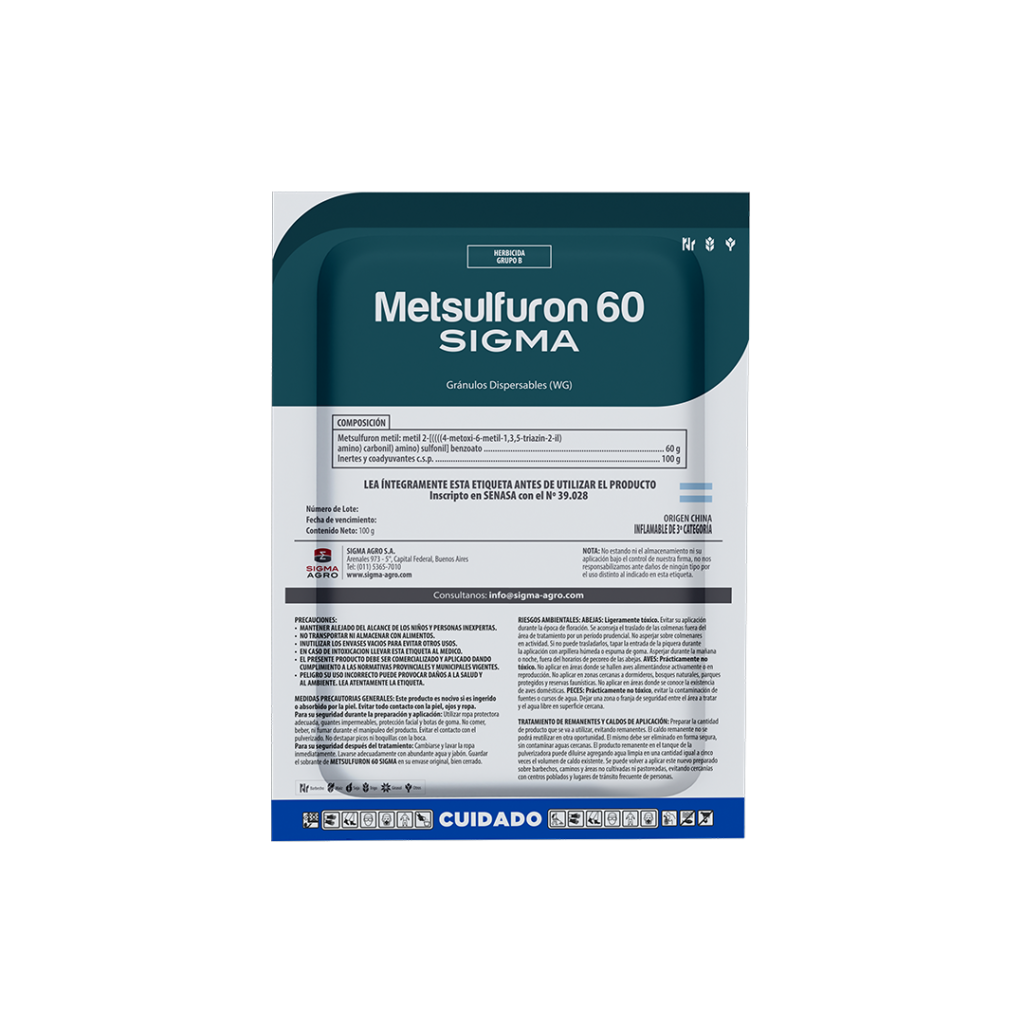 METSULFURON 60 SIGMA ES UN HERBICIDA SELECTIVO POSTEMERGENTE PARA EL CONTROL DE MALEZAS LATIFOLIADAS EN CEREALES DE INVIERNO. SE ABSORBE POR RAΓZ Y HOJA. ACTΓA INHIBIENDO LA ENZIMA ACETOLACTATO SINTETASA (ALS).