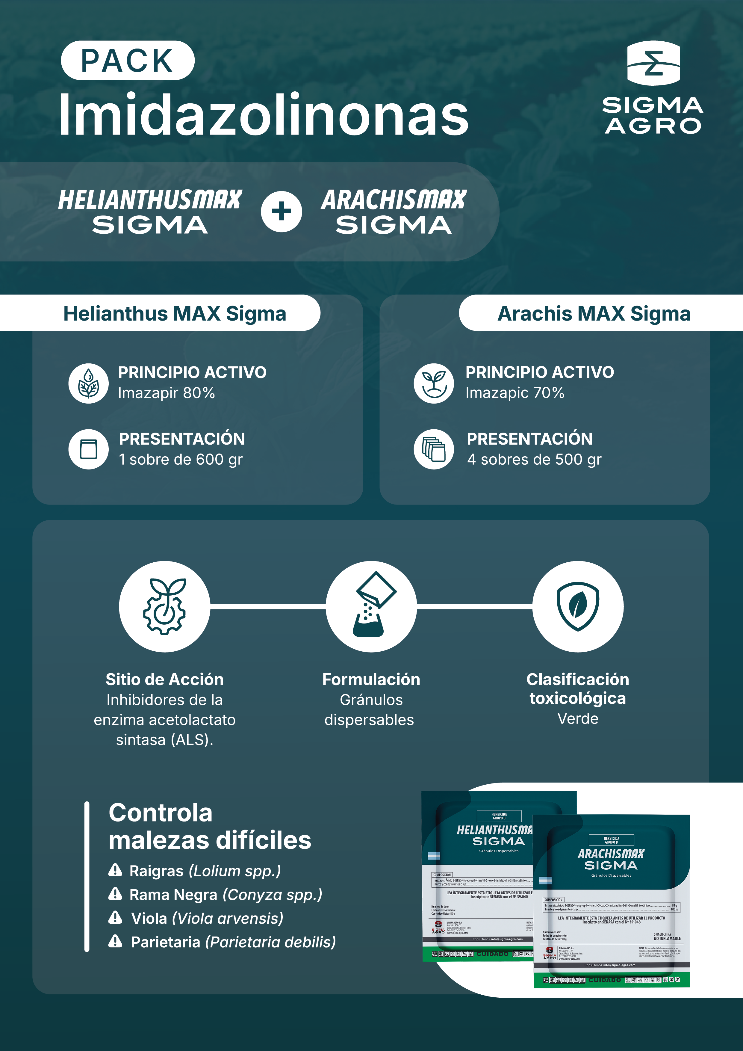 PACK IMIDAZOLINONAS INCLUYE DOS HERBICIDAS: HELIANTHUS MAX SIGMA + ARACHIS MAX SIGMA. Es una excelente opciΓ³n para el control de malezas difΓciles tanto de hoja ancha como gramΓneas. Ofrece un efecto residual impidiendo el desarrollo de nuevas emergencias.