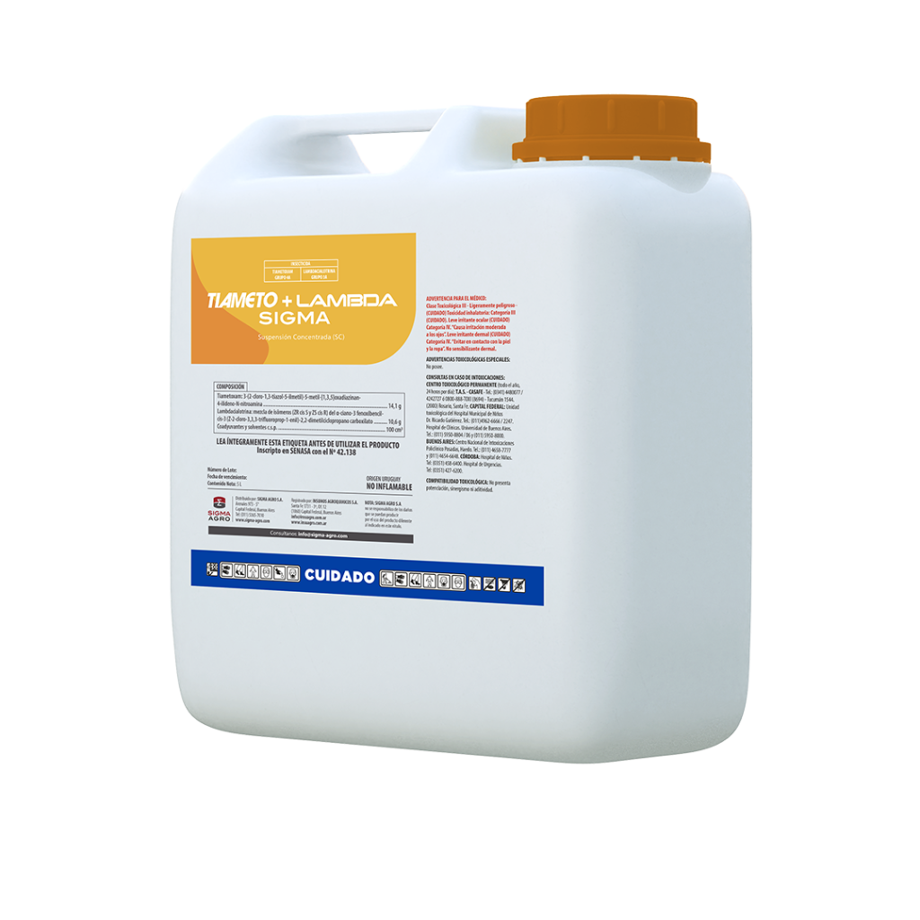 TIAMETO + LAMBDA SIGMA ES UN INSECTICIDA FOLIAR INTEGRADO POR DOS PRINCIPIOS ACTIVOS QUE POSEEN CARACTΓRISTICAS COMPLEMENTARIAS. EL TIAMETOXAM, ES UN NEONICOTINOIDE SISTΓMICO DE ALTA RESIDUALIDAD QUE CONTROLA INSECTOS Y SUCCIONADORES, MIENTRAS QUE LA LAMBDACIALOTRINA ES UN PIRETROIDE QUE ACTΓA SOBRE INSECTOS SUCCIONADORES Y CHUPADORES, OTORGANDO PODER DE VOLTEO.